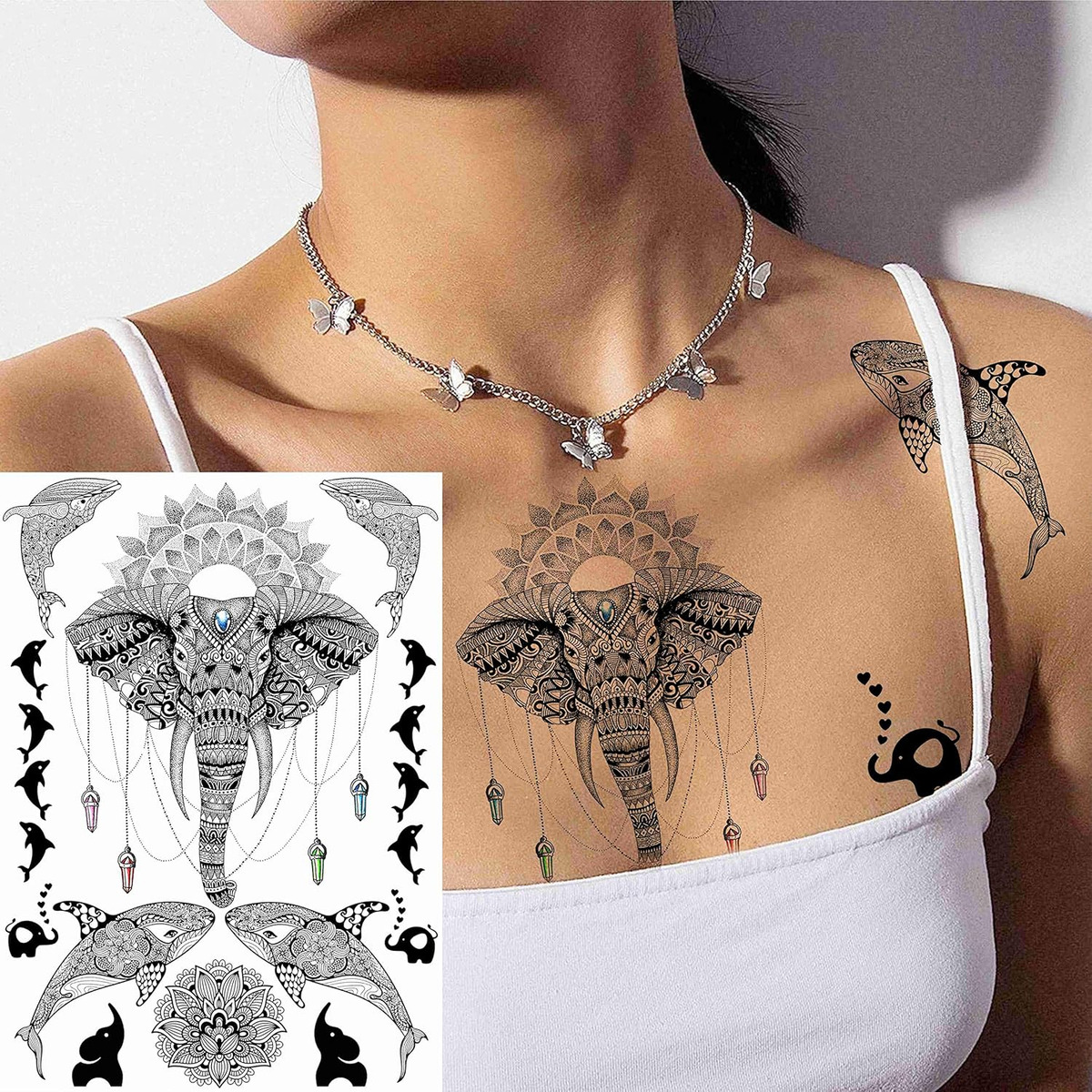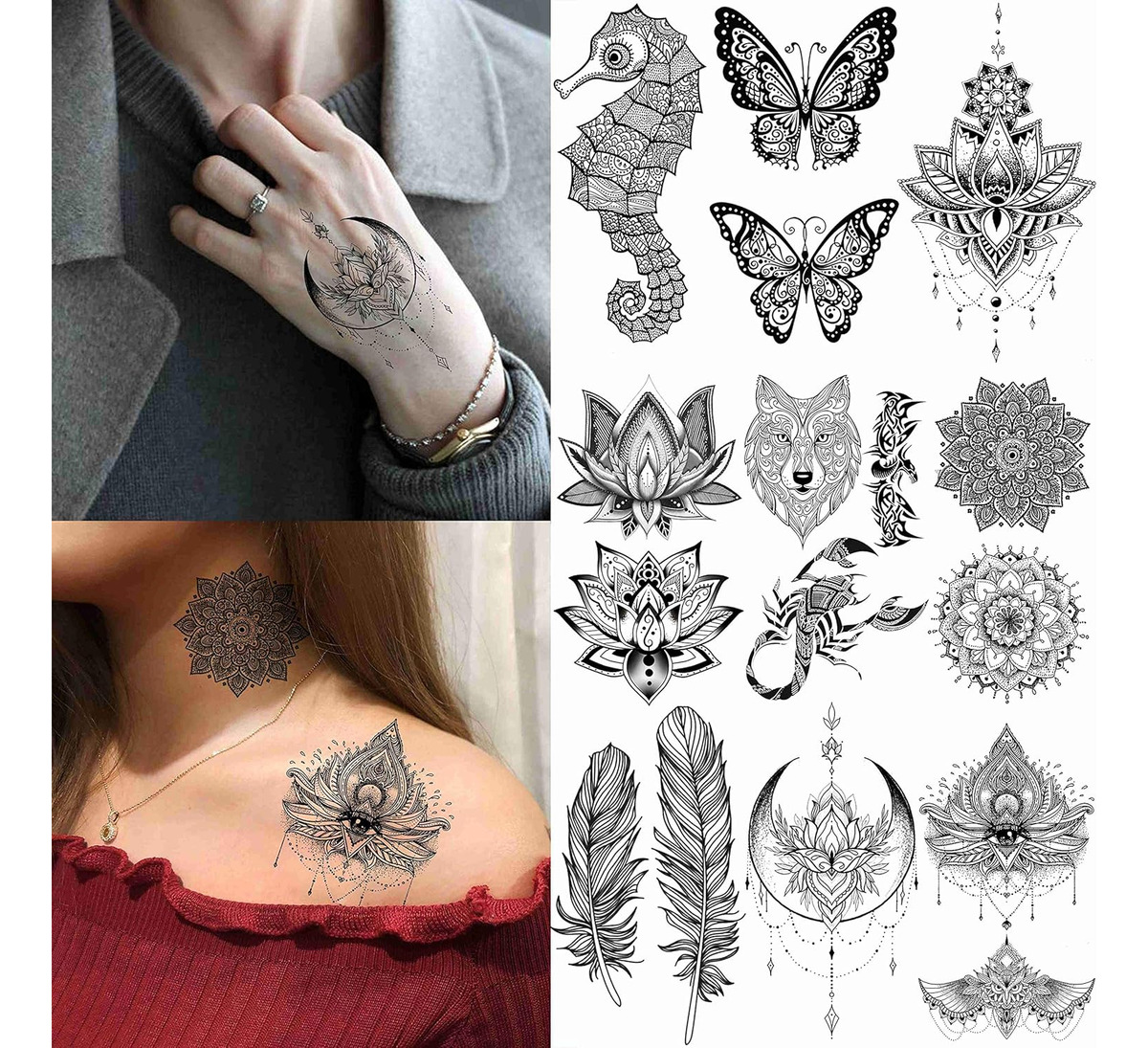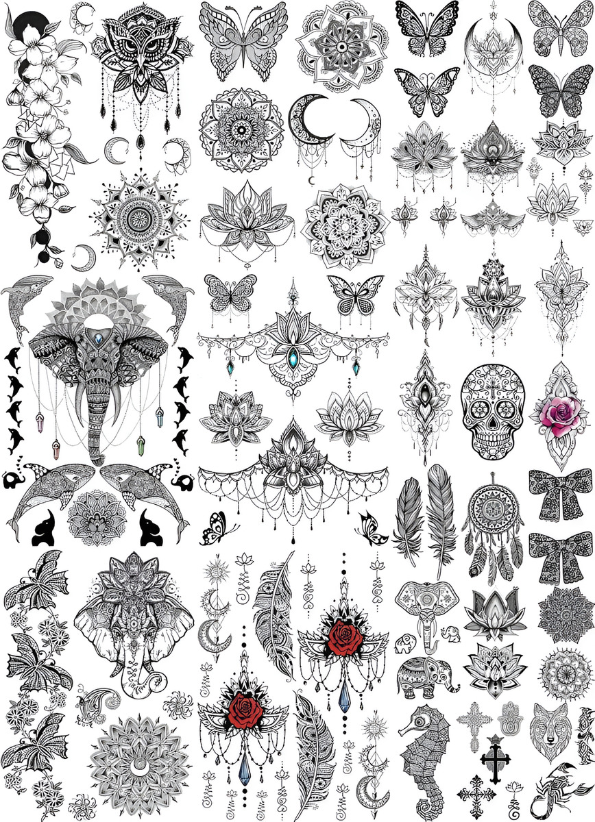 28 hojas de tatuajes temporales con diseño de moda EGMBGM marca original tribal elefante búho señor Ganesha ballena luna mandala flor plumas mariposa rosa loto joyas flores flores henna mehndi pulseras corona cadenas delfín colgantes diseños tatuajes temporales para adultos. Hay 6 hojas de tatuajes temporales grandes de henna en cada paquete de tamaño grande de 8.3 x 5.9 in y 22 hojas de 3.9 x 2.4 in.