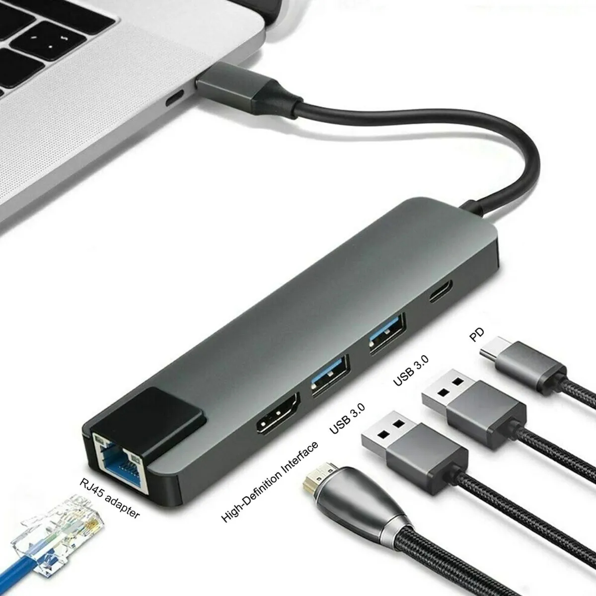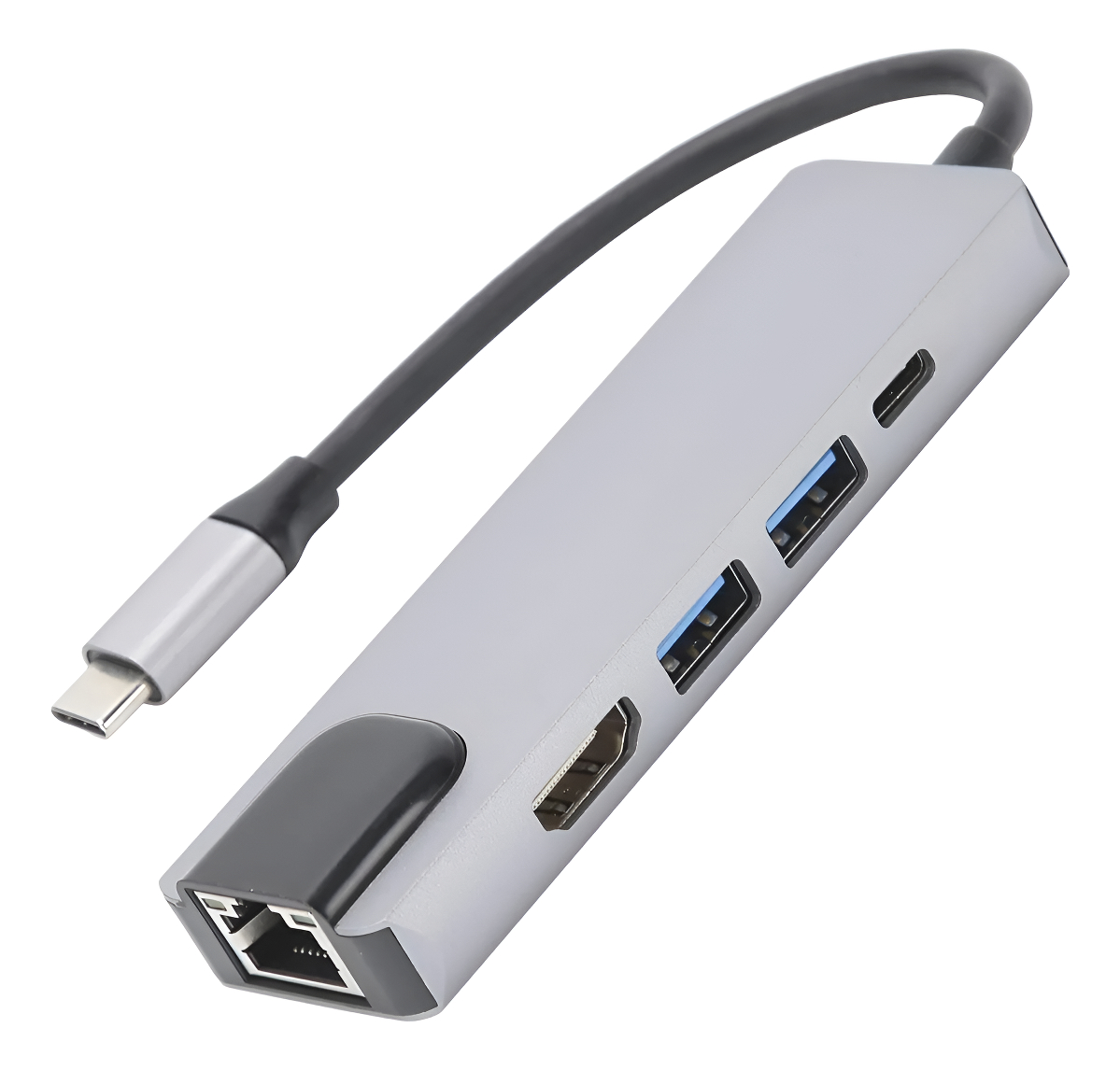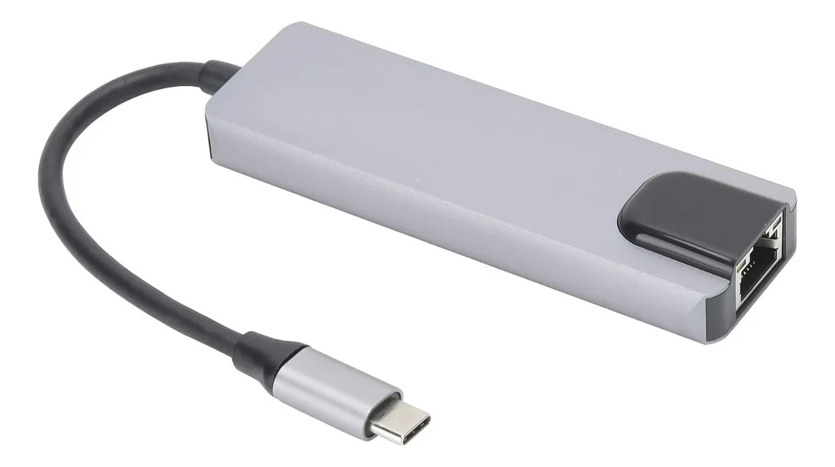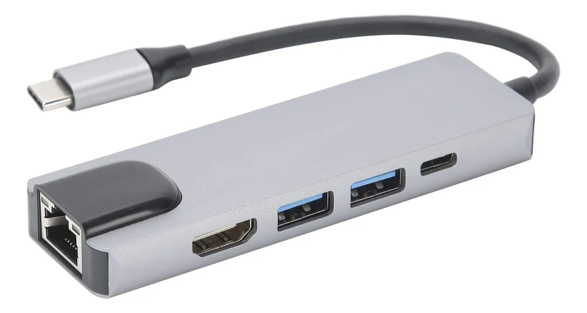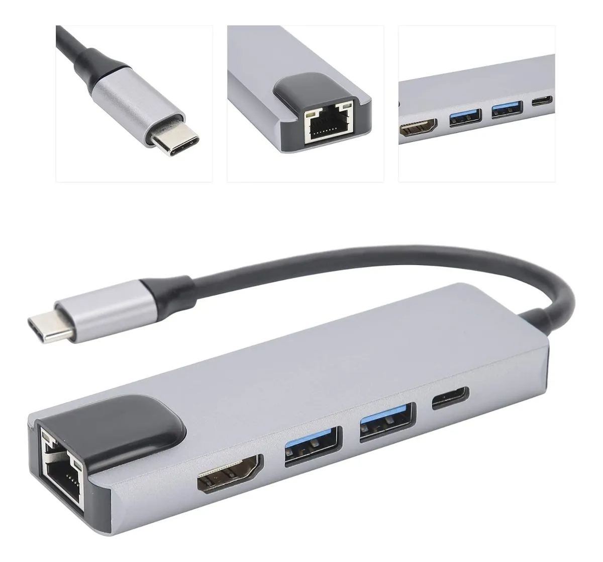 Hub USB Tipo C con puerto Ethernet 5 en 1, ideal para expandir las conexiones de tu dispositivo de forma práctica y eficiente.