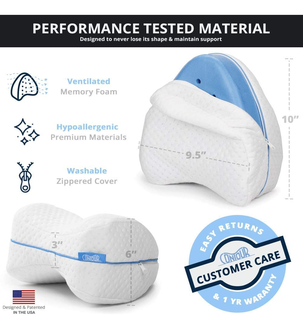 Duerme cómodamente en cualquier posición y muévete libremente a través de la noche: a diferencia de las almohadas de rodilla tradicionales, el Contour Legacy cuenta con un verdadero diseño ergonómico con sus curvas suaves y forma de media luna para adaptarse cómodamente a hombres y mujeres. Sin necesidad de correas peligrosas que restrinjan la circulación, la correa precisa de los contornos de la almohada se adapta a la forma natural de tus piernas. Esto permite que la almohada de espuma para piernas se adapte a tu forma sin restringir el movimiento o requerir que duermas en una determinada posición.