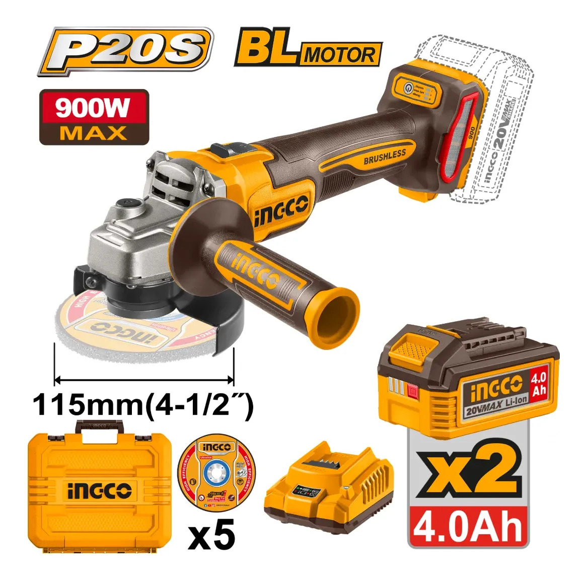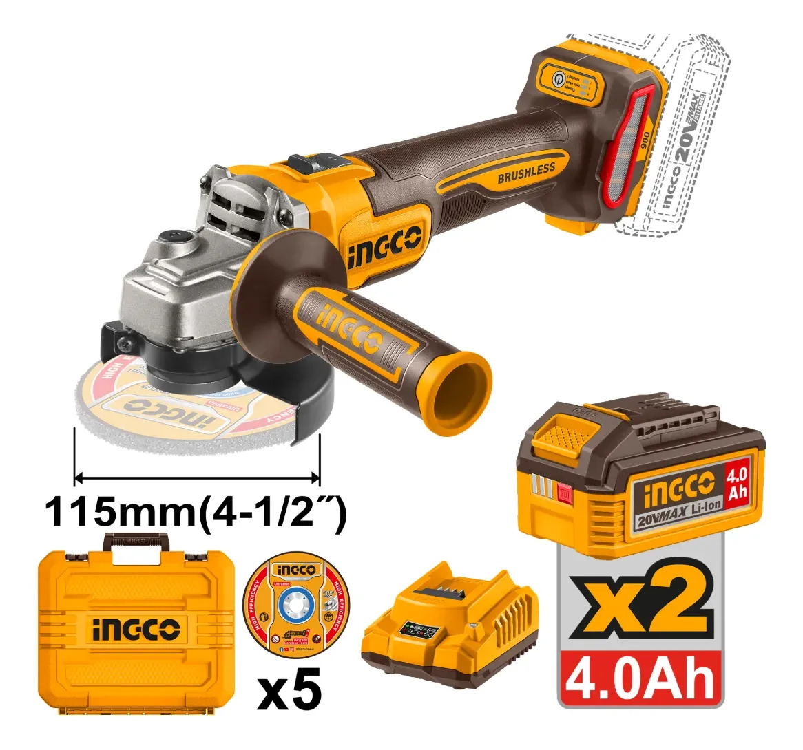Amoladora Angular 115mm 4 1/2 20v + Accesorios Ingco