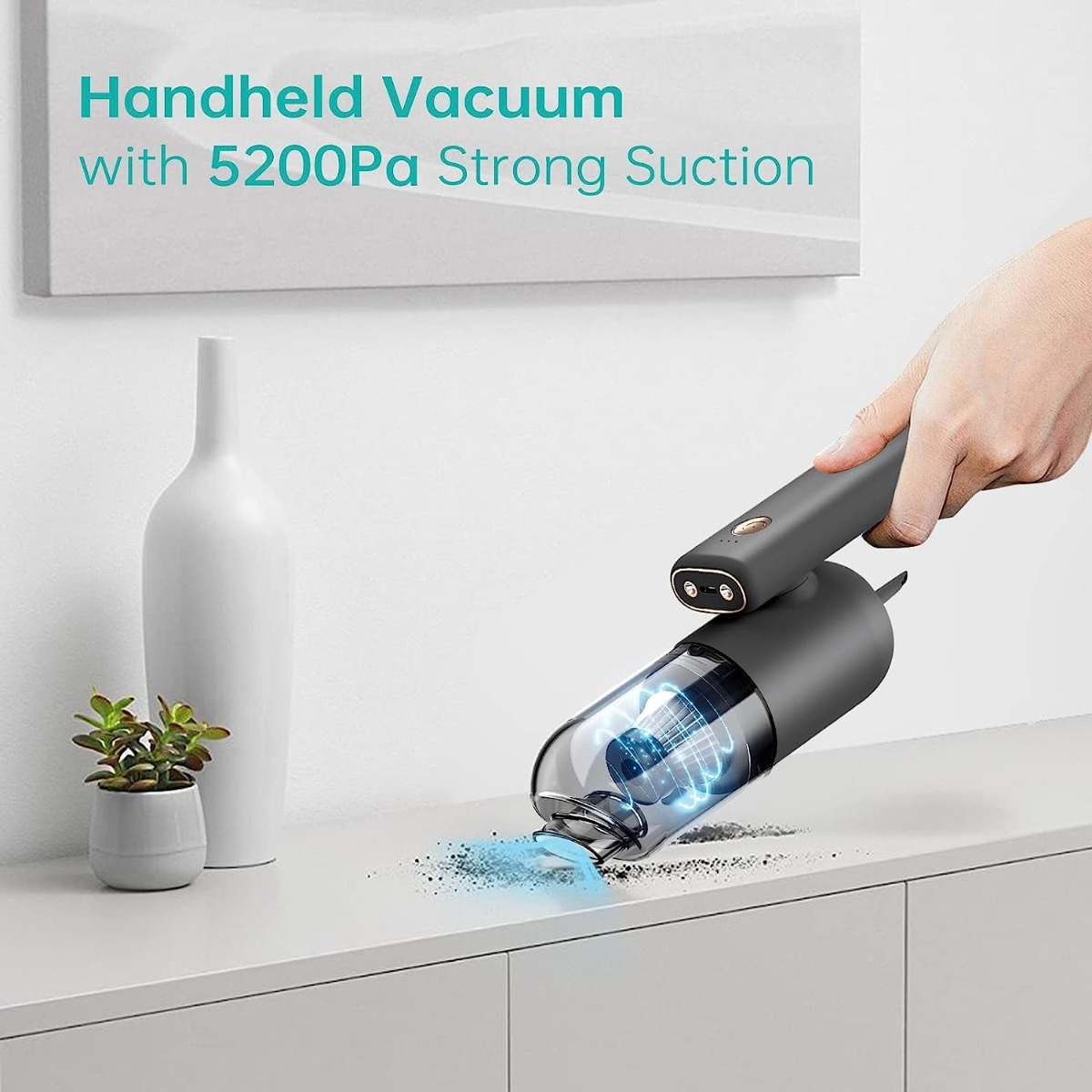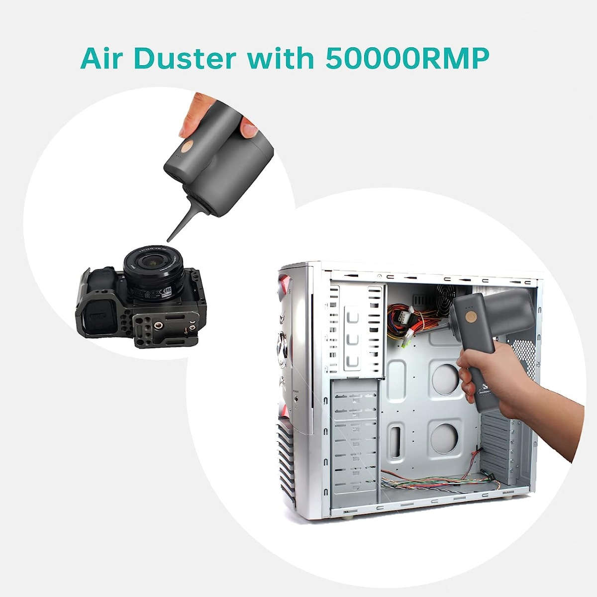 Potente succión de 5200 Pa: con una fuerte succión de 5200 Pa, nuestra aspiradora de mano puede aspirar fácilmente residuos, polvo, pelo y limpiar el interior de tu coche, sofá de habitación, muebles, escritorio de oficina rápidamente. Con 50000RMP, este plumero de aire eléctrico recargable limpiará eficazmente tu PC, teclado, lente de cámara, etc. Ya no se necesitan latas de aire desechables.