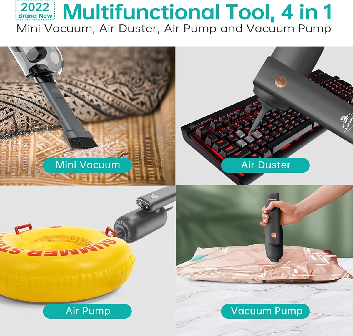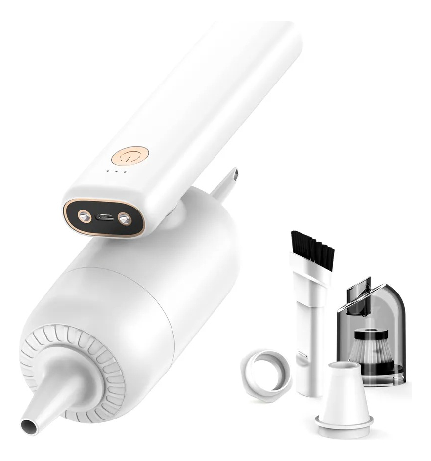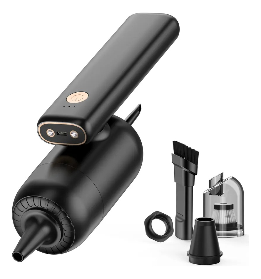 Multifuncional 4 en 1: esta innovadora aspiradora de mano no es solo una mini aspiradora, sino que también se puede utilizar como un plumero de aire, bomba de aire y bomba de vacío. Con función de vacío, puede recoger y capturar migas fácilmente y ayudarte a limpiar tu habitación, coche y oficina. Con función de plumero de aire, ayuda a soplar el polvo de tu computadora y teclado. Se puede convertir en una bomba de mano para tus bolsas de almacenamiento y una bomba de aire para tus anillos de natación. Será un ayudante útil en tu vida diaria.