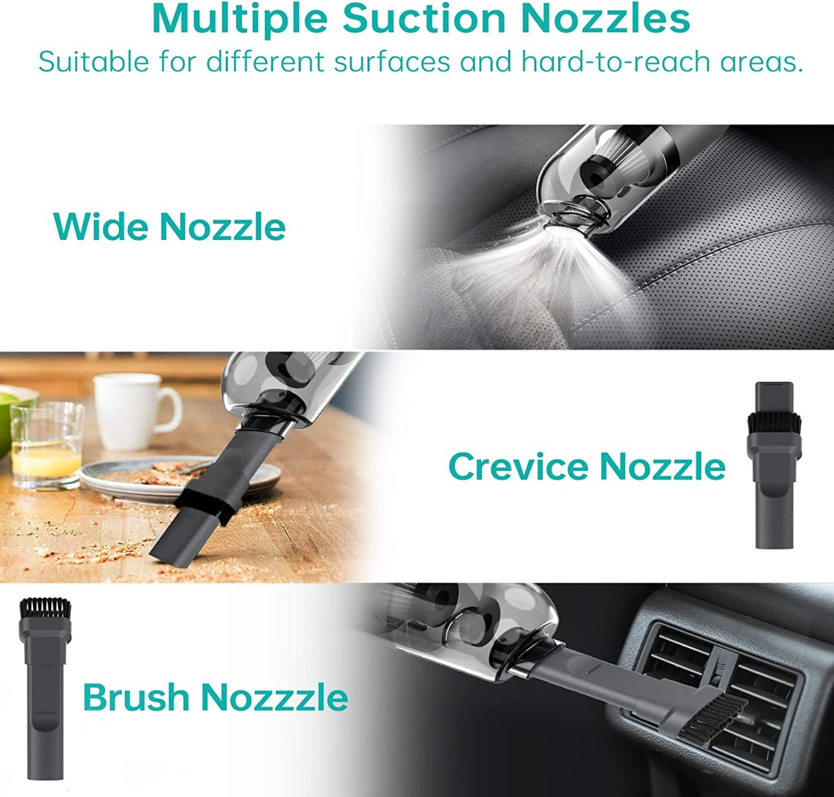 Múltiples accesorios y multiusos: diseñada con 3 boquillas de succión diferentes, boquillas anchas, grietas y cepillo, esta aspiradora de mano puede funcionar bien en diferentes superficies y zonas de difícil acceso. Con diferentes boquillas, puede recoger polvo, migas, pelo de mascotas y desechos de grietas fácilmente. También hay disponibles boquillas de soplado y bomba de vacío de diferentes tamaños.