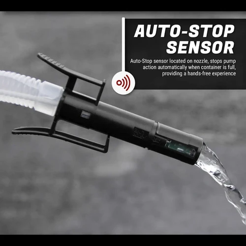 3 galones por minuto. Requiere 4 baterías AA (que no están incluidas). Manguera flexible de entrada. Boquilla de parado automático sin derrames.