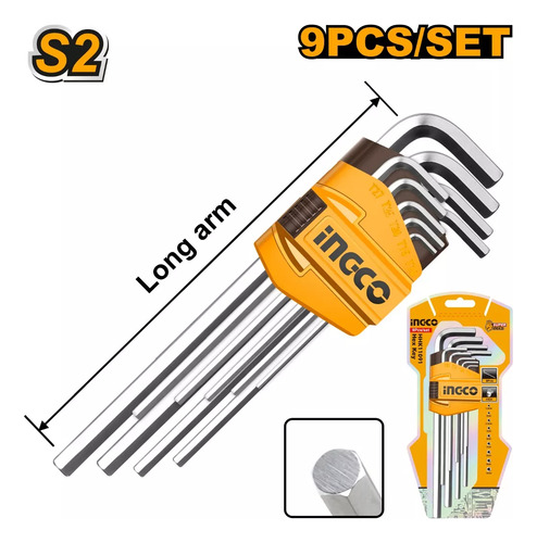 – Juego de llaves hexagonales HHK11091 (9 piezas) – Tamaños 1.5-10mm, brazo largo, tratamiento térmico, cromo.