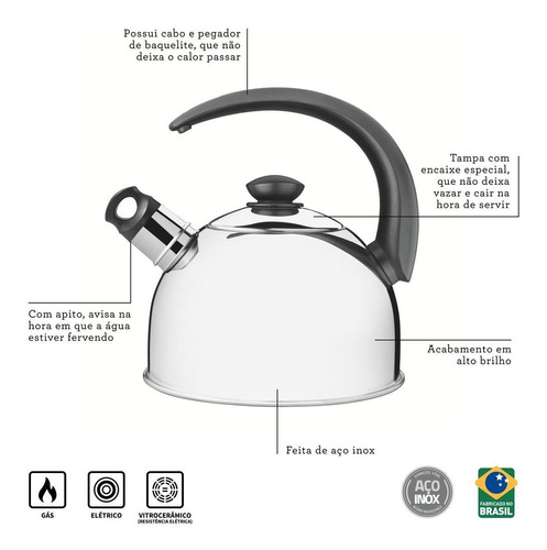 Utilice productos de calidad en su cocina para llevar a cabo sus tareas con más facilidad y calidad, la tetera con silbato de acero inoxidable Cabo Preto de 3 L de Tramontina es la elección correcta para hervir agua de manera eficiente y sencilla. Además de estar hecho completamente de acero inoxidable, un material muy duradero, este artículo también tiene un acabado brillante que hace que el producto sea aún más hermoso. Lo mejor de todo es que esta tetera tiene un silbato para avisarte cuando el agua está hirviendo dentro del recipiente y se puede utilizar en varios tipos de estufas.
