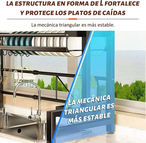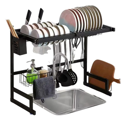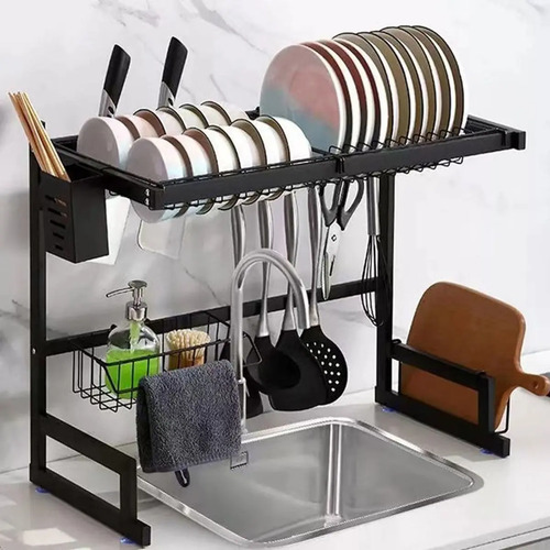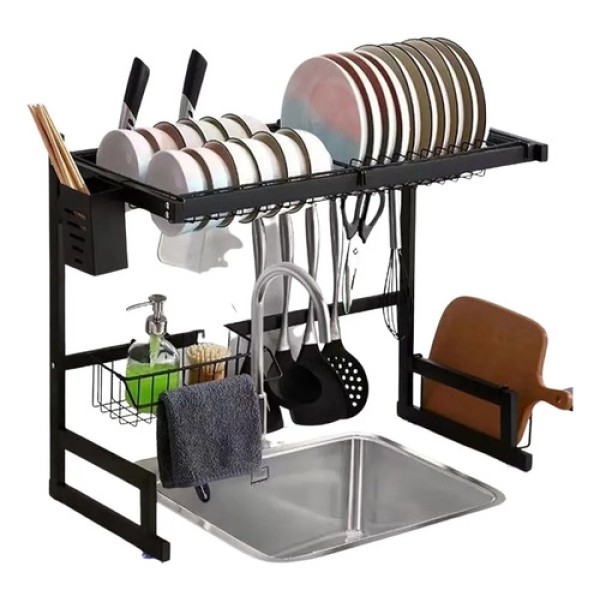 El escurreplatos multifuncional mantiene toda la vajilla o utensilios ordenados y secos fácilmente. El escurreplatos hace mucho, usted puede: poner tazón/plato o verduras/frutas en el estante, tomar el cuchillo de cocina/tabla de cortar/taza/cuchara y tenedor/limpiador en el soporte, o colgar el cucharón de sopa/espátula/trapo de cocina en el gancho. Un trastero superior para secar platos y tazas que ahorra espacio, no sólo para cocinas grandes sino también para cocinas pequeñas.