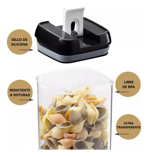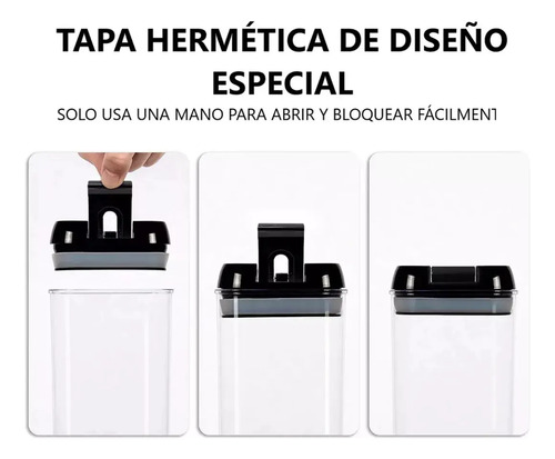El mecanismo especial de bloqueo de la tapa se utiliza para garantizar que los alimentos estén secos y frescos y protegidos de los insectos. Una vez que el anillo de la tapa se empuja hacia abajo, el sello de silicona dentro de la tapa se expandirá para sellar el frasco, creando una hermeticidad completa. Vuelva a colocar el anillo y sirve como manija para levantar la tapa. Proporciona máxima frescura y almacenamiento prolongado de alimentos.