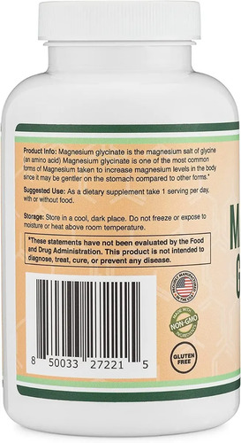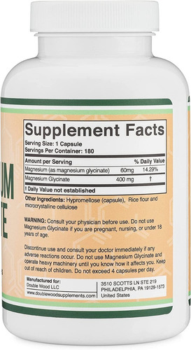 Suministro de seis meses: el suplemento de glicinato de magnesio de Double Wood de 400 mg contiene 180 cápsulas de 400 mg cada una. Suficientes porciones para durar 6 meses.