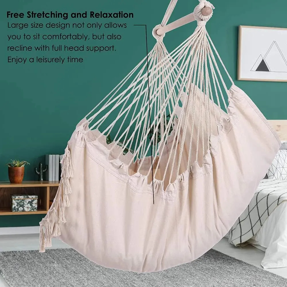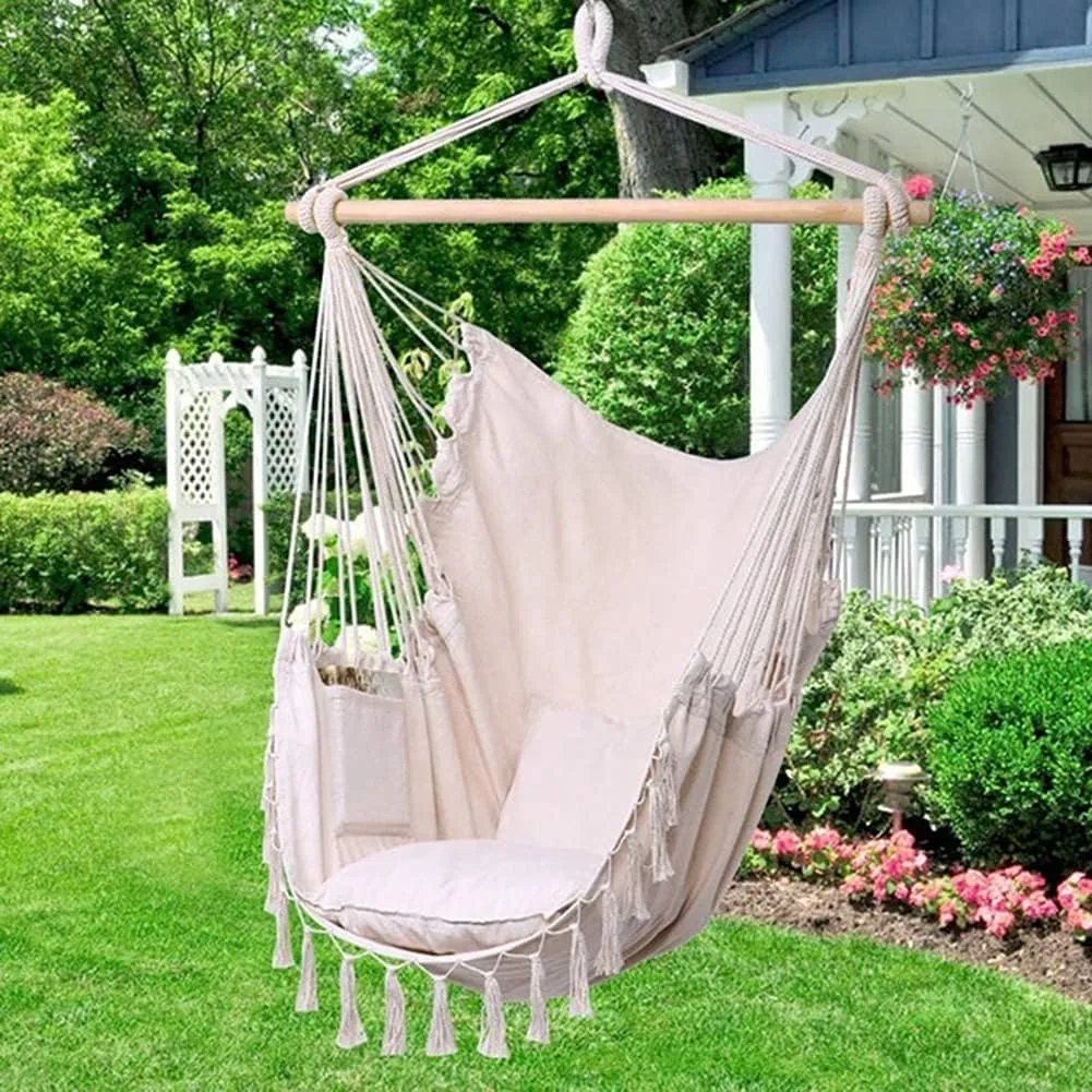 Silla hamaca colgante tipo columpio con cuerdas, hecho con tejido de macramé grande y bolsillo para comodidad y durabilidad.