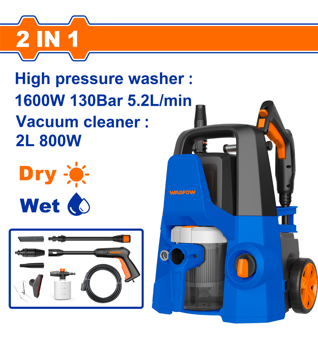 Hidrolavadora aspiradora 2 en 1 1600W – Limpieza completa con alta presion y succion eficiente para el hogar y vehiculos.
