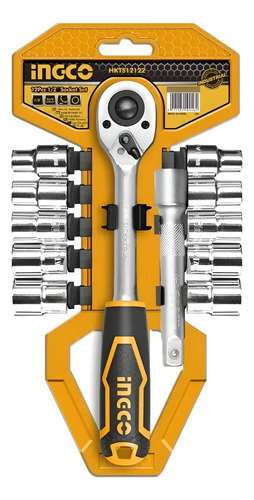 Juego de Enchufes 12pza 1/2″ Incluye 10pza zócalo 10,11,12,13,14,15,17,19,21,24mm Mango de trinquete de liberación rápida 1 1/2″45T 1 barra de extensión de 5 » Acero CrV 50BV30 de alta calidad Micro acabado y cromado Embalado por percha de plástico
