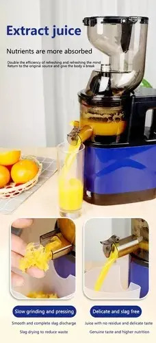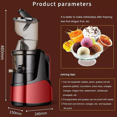 El exprimidor de prensado en frío vertical cuenta con un motor de baja velocidad que gira silenciosamente para producir una mínima acumulación de calor y oxidación para el jugo que extrae el máximo de nutrientes, vitaminas y enzimas que aumentan la inmunidad y mejoran la salud. Tiene un mejor sabor que el otro exprimidor.