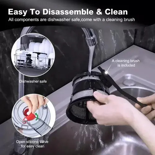 La tapa de jugo está equipada para evitar goteos que pueden hacer fácilmente jugo mezclado. El diseño de puerta abatible de este exprimidor de masticación lenta hace que sea más fácil y seguro de usar.