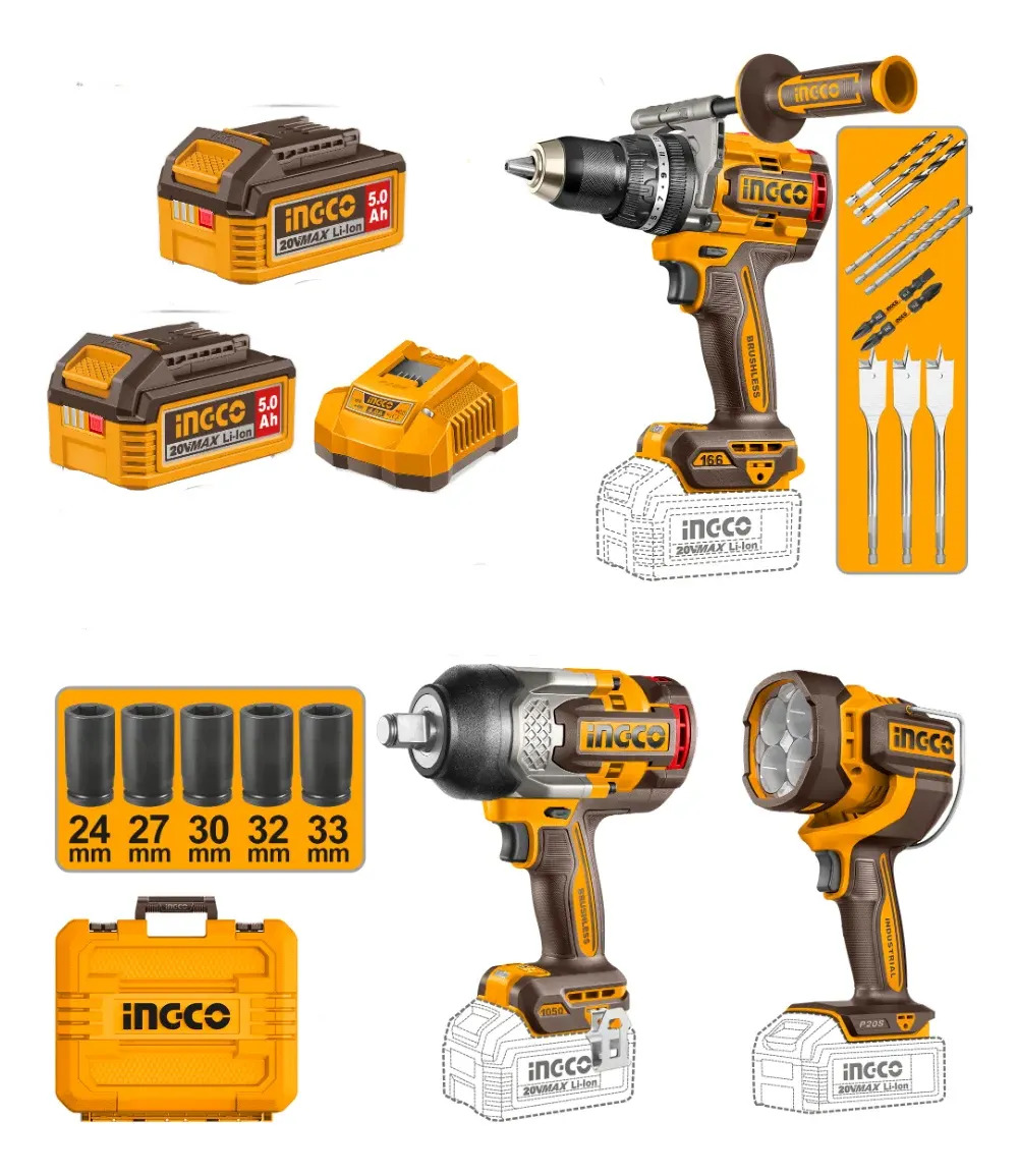 KIT COMBO A BATERIA P20S 20V TALADRO ATORN. PERCUTOR 166NM + LLAVE DE IMPACTO 1050NM 3/4″ + LINTERNA 2000 LUMENS + 2 BAT 5.0AH + CARGADOR + ACCESORIOS + VALIJA