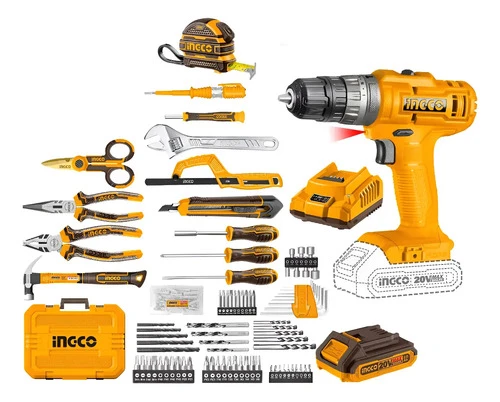 Kit completo para tareas de perforación y reparación en el hogar o el taller. Incluye un atornillador percutor a batería y un extenso set de herramientas manuales, todo en una práctica valija de transporte.
