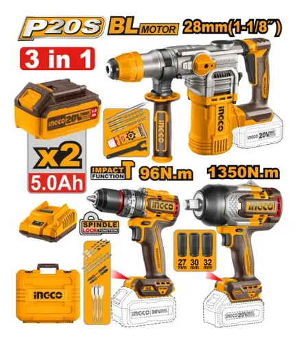 KIT COMBO A BATERIA P20S ROTOMARTILLO 28MM + TALADRO ATORNILLADOR C/PERCUTOR 96NM + LLAVE DE IMPACTO 3/4″ 1350NM C/2 BAT, CARGADOR, VALIJA + ACCESORIOS INGCO COSLI250281 OTP