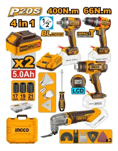 KIT COMBO A BATERIA P20S 20V C/ LLAVE DE IMPACTO + TALADRO ATORNILLADOR C/PERCUTOR + HERRAMIENTA MULTIFUNCION + PISTOLA DE CALOR C/ 2 BAT, CARGADOR, ACCESORIOS Y VALIJA