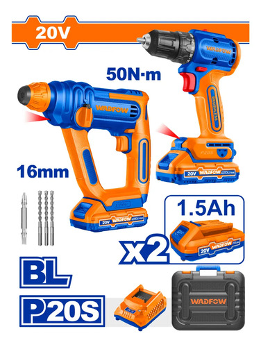 COMBO TALADRO A BATERIA 10MM C/PERCUTOR BRUSHLESS 20V P20S + ROTOMARTILLO A BATERIA 1,5J 20V P20S EN VALIJA C/2 BAT