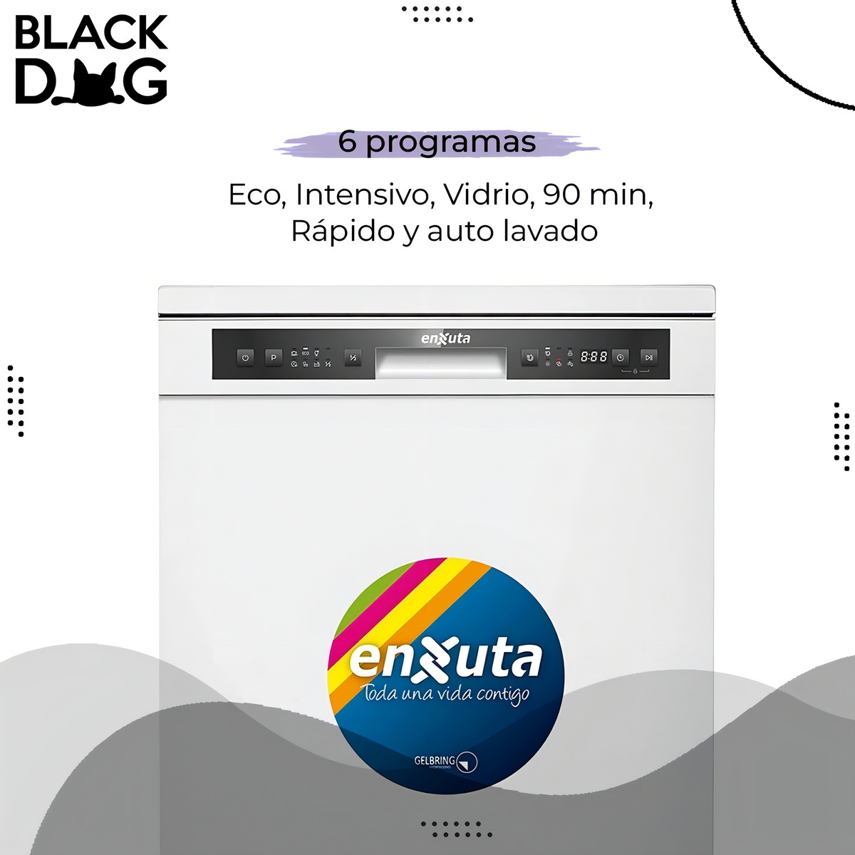 – 6 programas: Eco, Intensivo, Vidrio, 90 min, Rápido y auto lavado