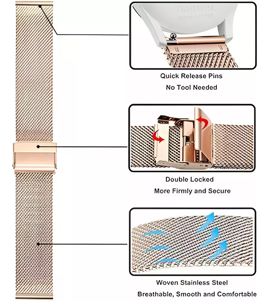 Las barras de resorte de liberación rápida están incluidas e integradas en la correa del reloj, son fáciles de instalar y reemplazar.