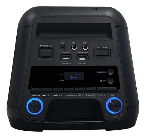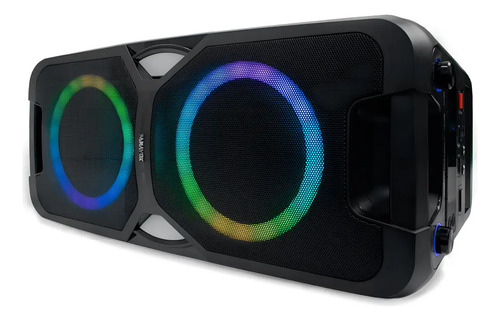 Parlante PANAVOX Party TWS BT Marca PANAVOX Modelo Party TWS Conectividad inalámbrica Bluetooth 5.0 TWS (True Wireless Stereo) Conectividad Auxiliar Entrada para micrófono 2 entradas de micrófono para karaoke. USB 1 para datos 1 para carga Sonido Parlantes 2 parlantes activos de 6.5″ Potencia de parlantes 50W (25W x 2 RMS) Ecualización Preestablecido Función super bass Radio FM Con buscador digital (PLL) Diseño y materiales Manija para facilitar su transporte Potencia y consumo Detalles Incluye Micrófono Luces decorativas Opcionales Batería Tipo de batería Recargable de 4000 mAh Dimensiones y peso Peso 6.9 kg Medidas 61.2 x 26.8 x 26.5 cm (alto x ancho x profundidad) Medidas con embalaje 64.5 x 33.5 x 32 cm (alto x ancho x profundidad) Código: 39840