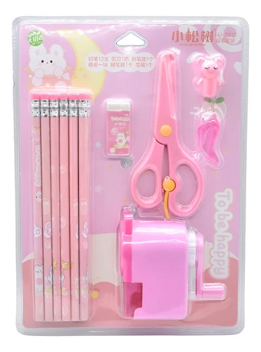 Incluye: 12 lápices, 1 goma de borrar, 1 tijera, 1 sacapuntas, 2 adornos para lápices.