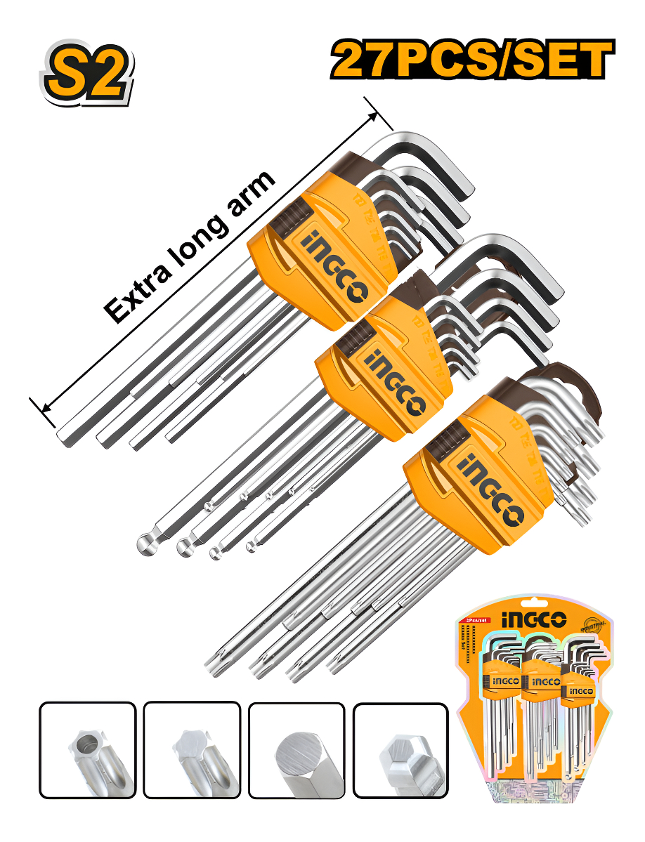 Set X 27 Llave Allen Y Trox Extra Larga Ingco Hhkset0271