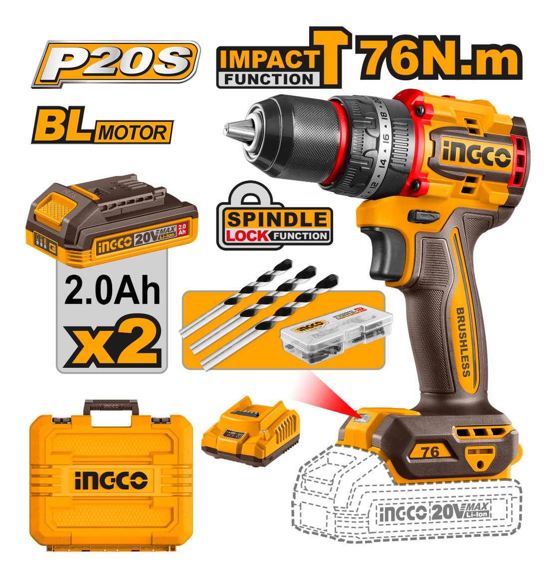Taladro Atornillador con Percutor 20V P20S Brushless con 2 Baterías, Cargador, Accesorios y Valija – Potencia y versatilidad profesional
